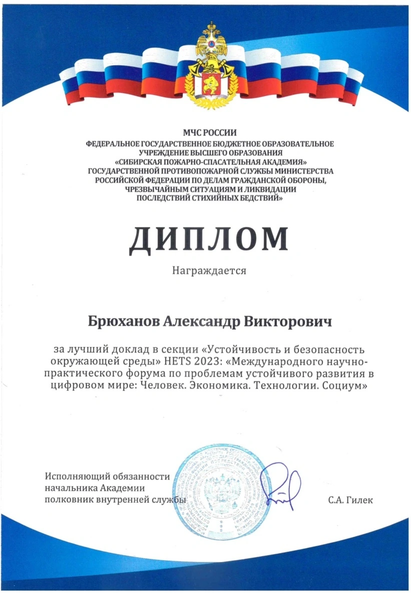Научный доклад заведующего лабораторией лесной пирологии ЦЛП филиала ФБУ ВНИИЛМ Александра Брюханова «Анализ причин возникновения лесных и иных природных (ландшафтных) пожаров, принесших наибольший ущерб населению в мире», был признан лучшим в работе секции «Устойчивость и безопасность окружающей среды» и отмечен особым дипломом.